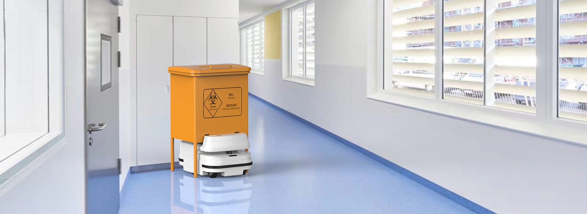 醫療垃圾管理運輸系統以機器人配送系統為基礎,搭配可裝卸的垃圾桶及固定垃圾箱支架,實現手術室垃圾通過系統直接運輸至垃圾回收站,達到對術后醫療垃圾的安全管理。